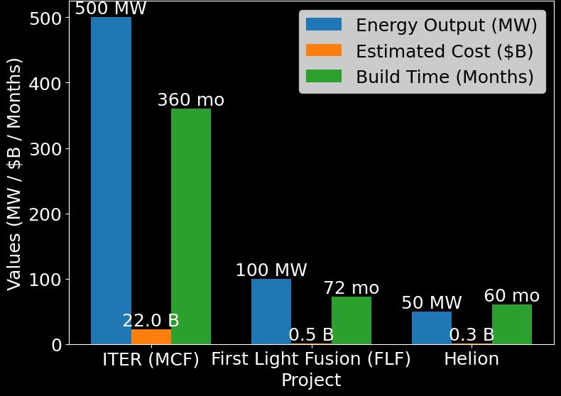 The data clearly illustrate a significant contrast in both scale and cost efficiency across the three fusion projects ITER, FLF, and Helion.