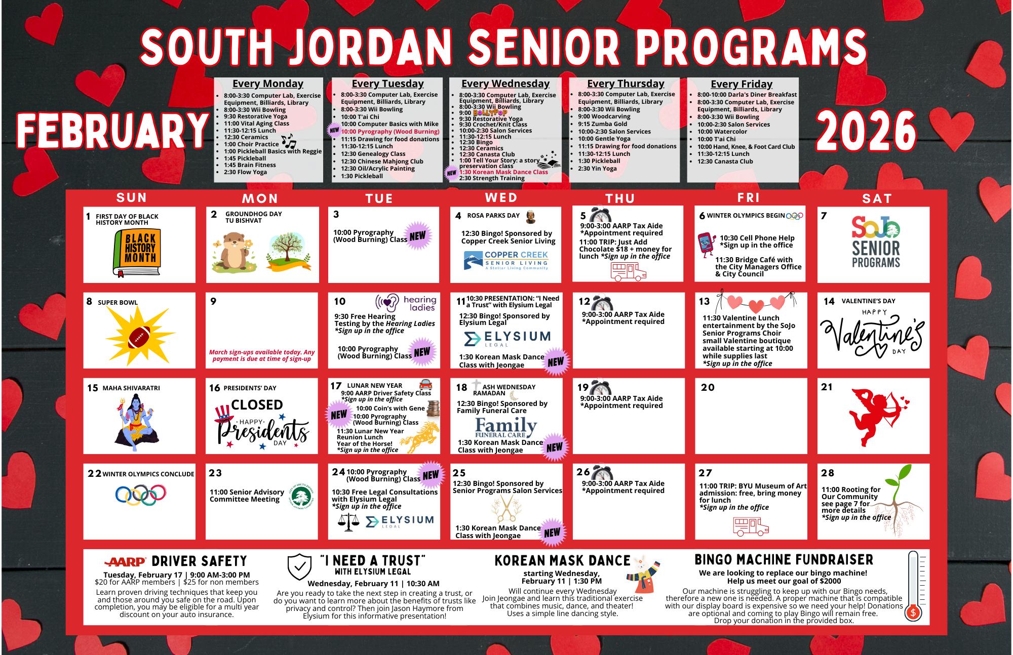 Transportation to and from Senior Programs is available for South Jordan Residents ages 60+ free of charge. Reservations need to be made no later than the day before a ride is needed. Please call 801-302-1222 or 801-253-5203 ext. 1102 to schedule a ride.