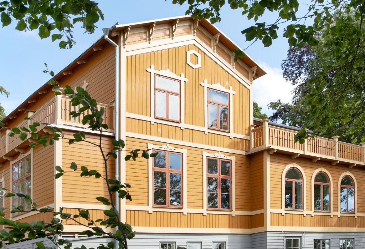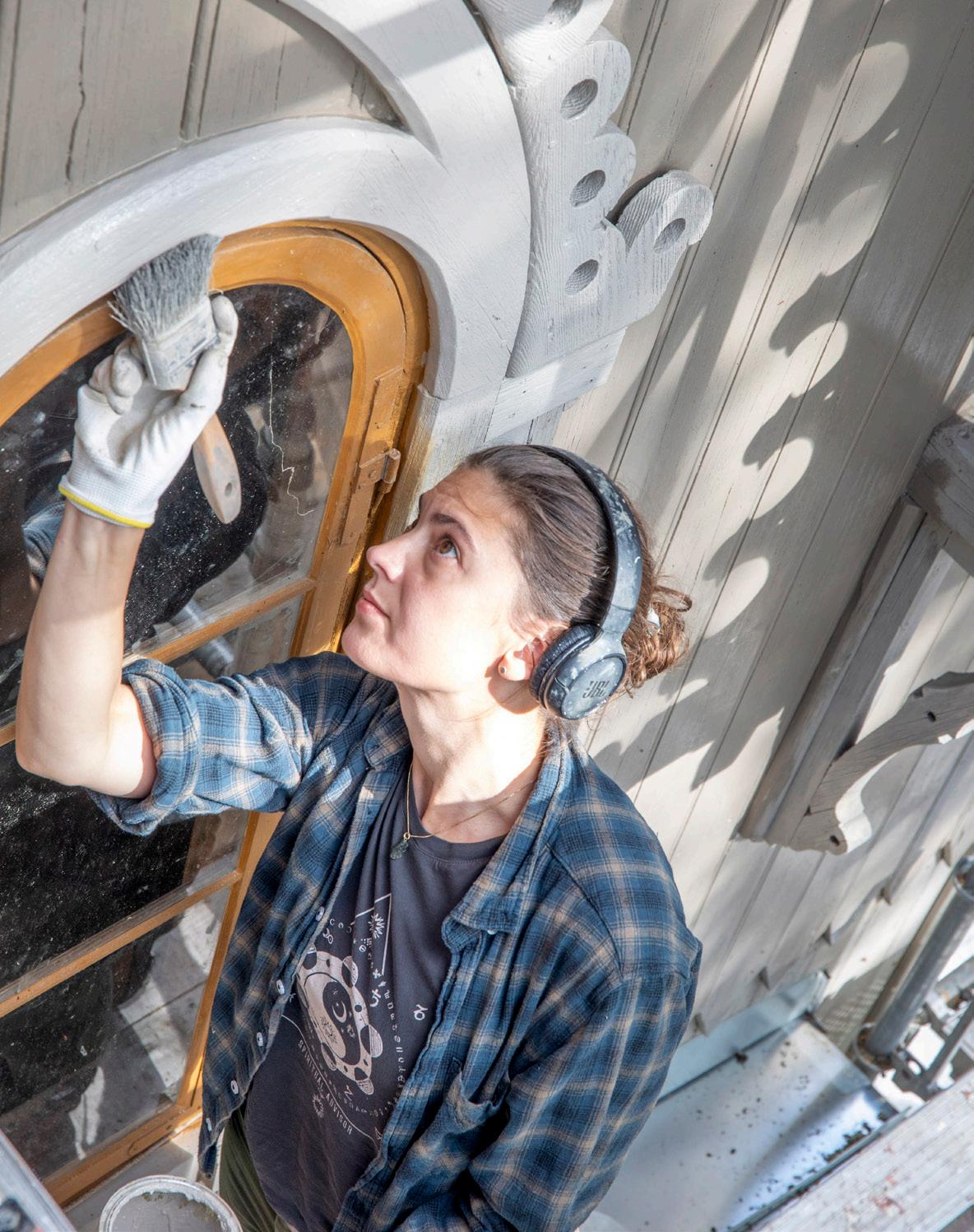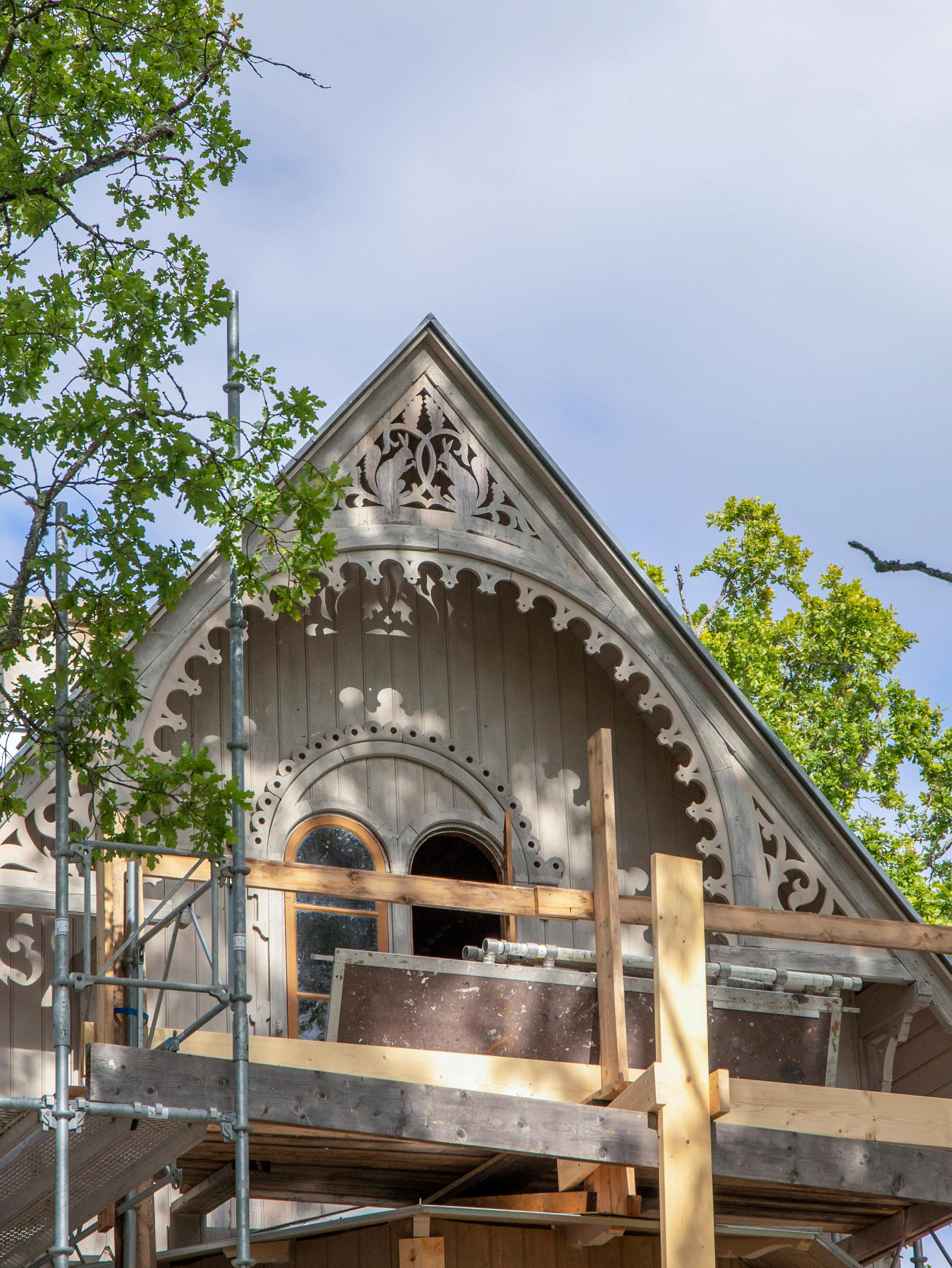 På en kulle mellan ekarna står den gula villan i strålande solsken som verkligen lyfter linoljefärgens okraton. Det är ett av husen som i hög utsträckning börjar bli klart. Nio olika arter handmålade blommor med tillhörande löv pryder ett av sällskapsrummens väggar och visar på den tid och det engagemang som lagts ner på detaljer. Rosenpaviljongen intill där konserter åter kommer att hållas, har återställts med sina varmt färgade fönster som reflekterar vackert i trägolvet. Men inte varje byggnad står i sin forna glans ännu. I Ekorrhuset pågår arbetet för fullt. Emely Pentell står på en byggnadsställning i kortändan och målar en fönstergavel för hand. Hon har arbetat här heltid under stor del av Haglunds period och lärt sig mycket. Varje hus med sina specifika utsmyckningar och fasader kräver olika noga övervägda beslut och tekniker.