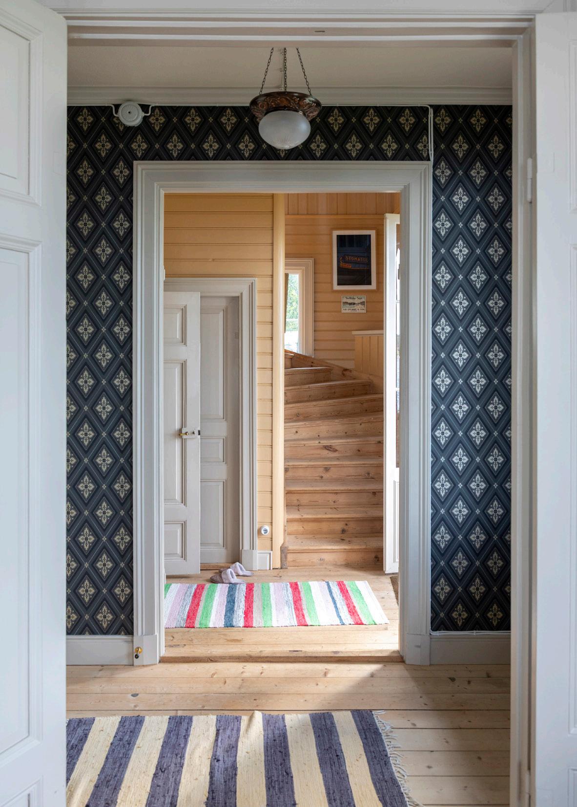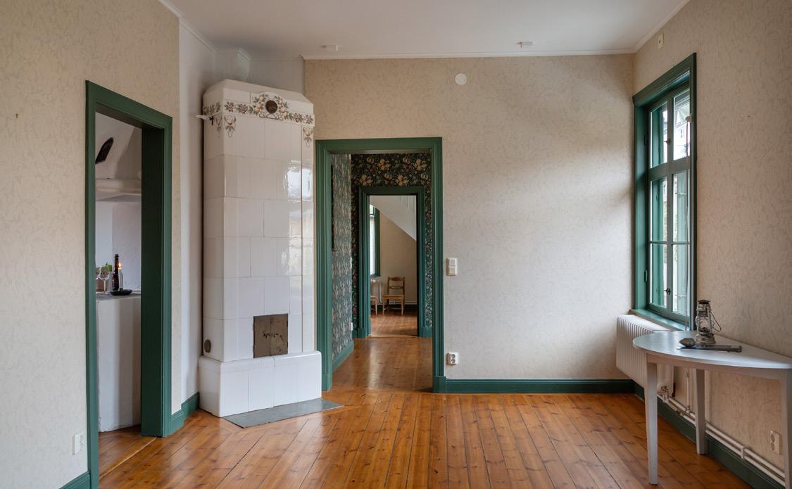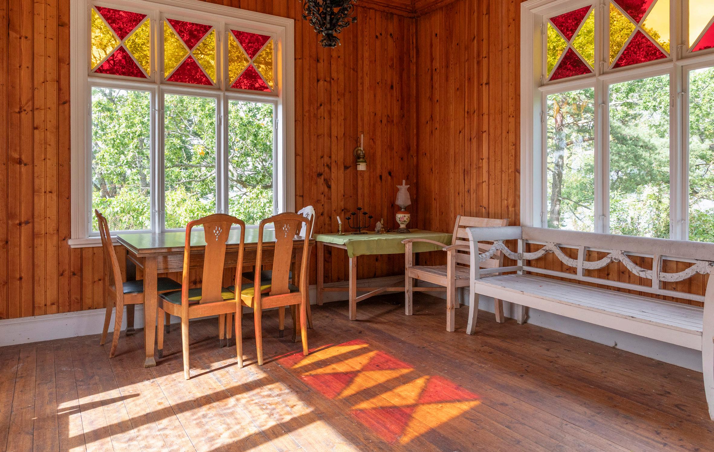 Tapeterna hänger i flagor från väggarna i samklang med gamla textilier. Det påminner om något från en spökfilm och samtidigt är de vackra detaljerna lika framträdande här som överallt på ön. Den lilla inbyggda sitthörnan i trappen med hjärtformad snickarglädje till exempel. I växthuset har det börjat odlas igen och med en trädgårdsmästares handlag kommer gräsytor, rabatter och odlingar åter stå i sin forna glans.