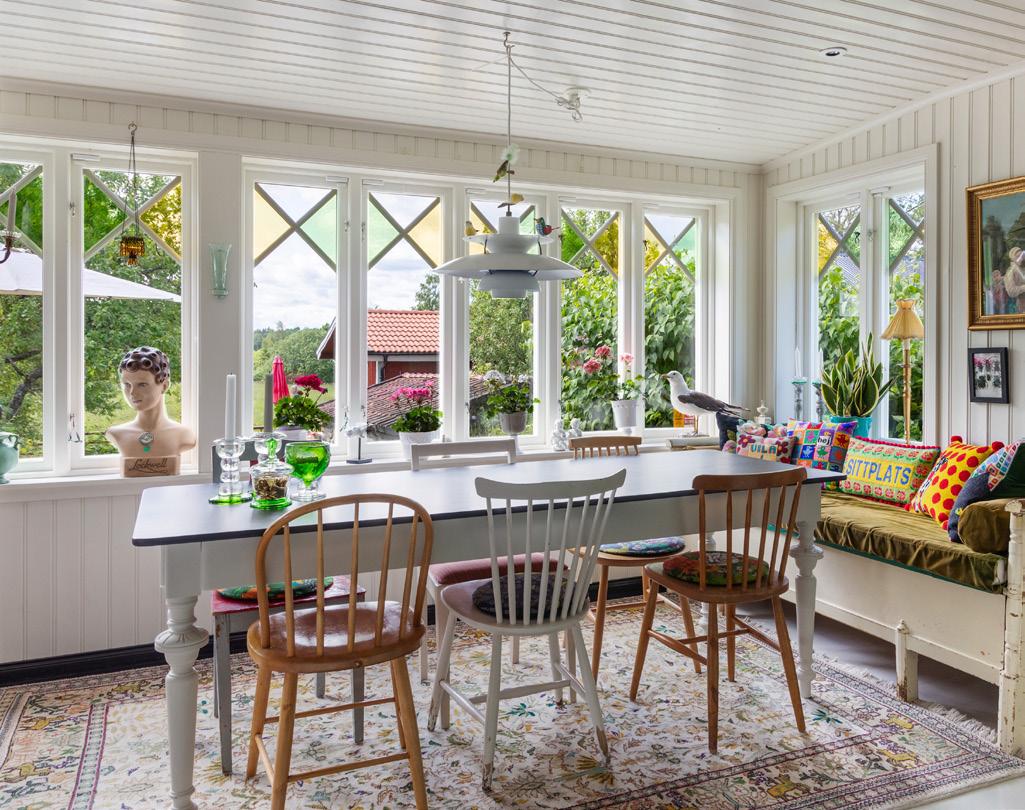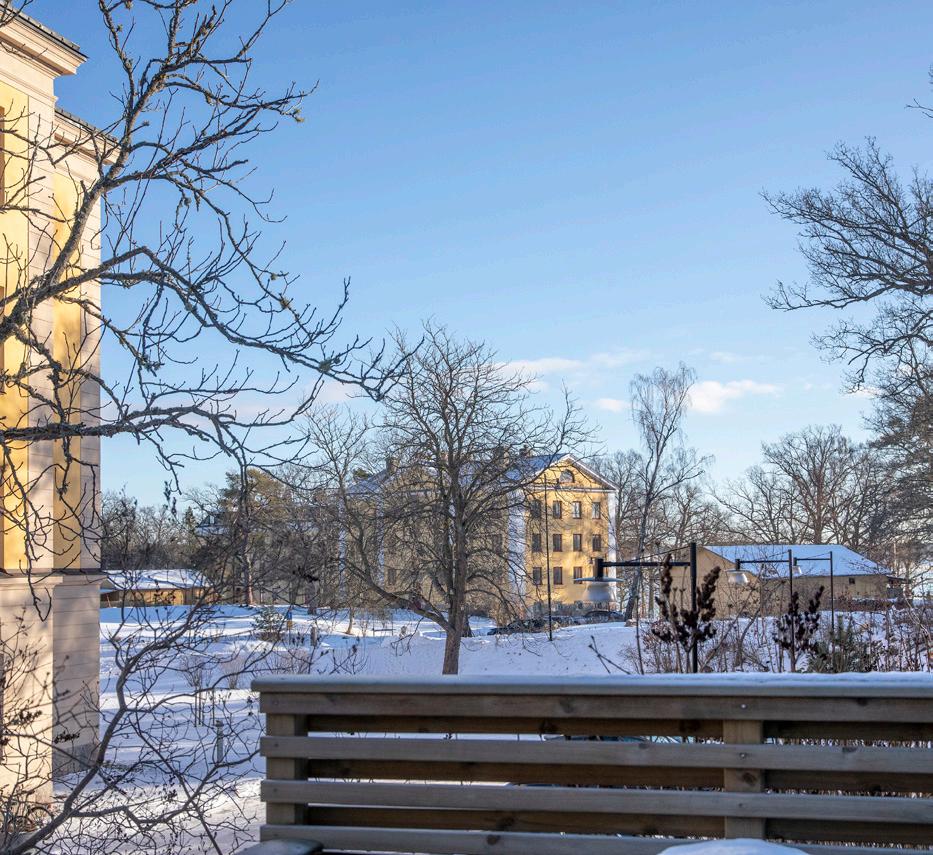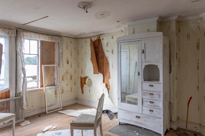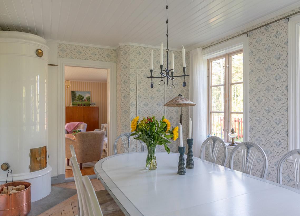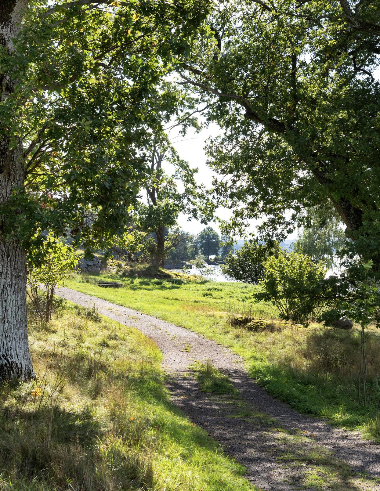Tapeterna hänger i flagor från väggarna i samklang med gamla textilier. Det påminner om något från en spökfilm och samtidigt är de vackra detaljerna lika framträdande här som överallt på ön. Den lilla inbyggda sitthörnan i trappen med hjärtformad snickarglädje till exempel. I växthuset har det börjat odlas igen och med en trädgårdsmästares handlag kommer gräsytor, rabatter och odlingar åter stå i sin forna glans.