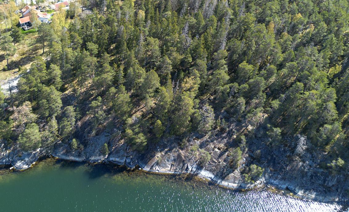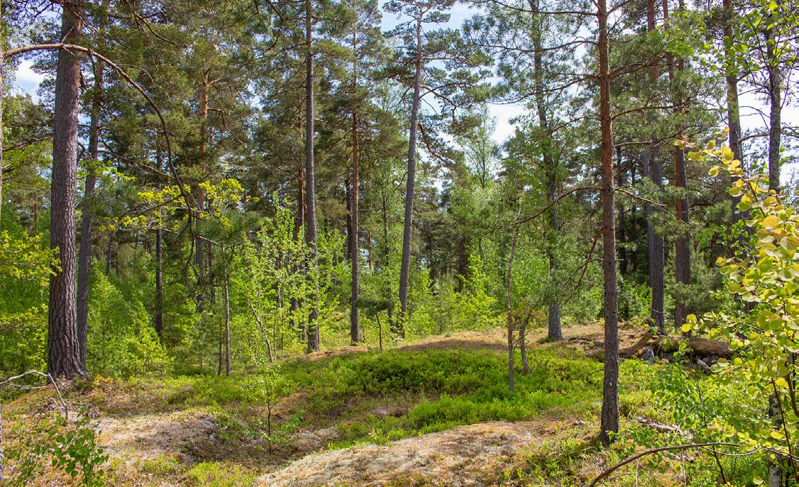 Härlig naturtomt med fina flata berghällar, lavar och gröna stora träd. En lättbyggd tomt med kommunalt vatten och avlopp intill tomtgränsen. Ett ljust och fritt läge mot grönområde. Läget är sist in på återvändsgata utan trafik. Bygg nytt och modernt efter naturen i sydvästläge med mycket sol.
