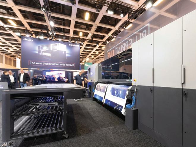 substrates at speeds of up to 1450 m²/h. Its impressive uptime is due to its 30-second job setup using robotics and various automated features, making it a true game-changer. At FESPA, the printer was demonstrated with a ¾ automation setup, featuring a lay table and an unloading robot.