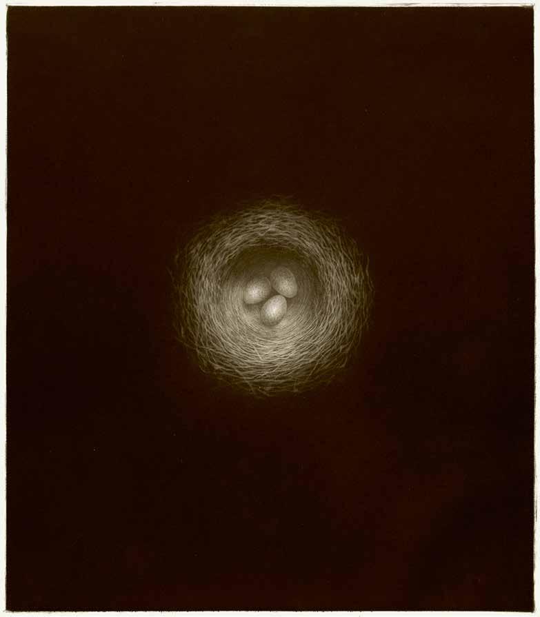 Det dype, myke, nesten lodne mørket som omgir redet i bildet Rede fra 2017, er det bare mezzotinten som kan få fram. Det svarte får en helt særegen stofflighet og dybde i dette mediet, noe som er tydelig i bildet, hvor redet nesten svever i mørket. Redets sirkelformede, intime sfære står i kontrast til det betrakteren opplever som et uendelig mørke. Komposisjonen er enkel, med redet sett ovenfra og plassert i bildets sentrum. Synsvinkelen forsterker opplevelsen av at redet omslutter og skaper et beskyttende rom for de sårbare eggene. Bildet har en komposisjon som i kunsthistorien ofte fins i religiøse motiv, og det er ikke unaturlig å tolke bildet som et uttrykk for livets under. Lyset i det store mørket bidrar til denne opplevelsen og gir bildet en karakter av et refleksjonsobjekt.