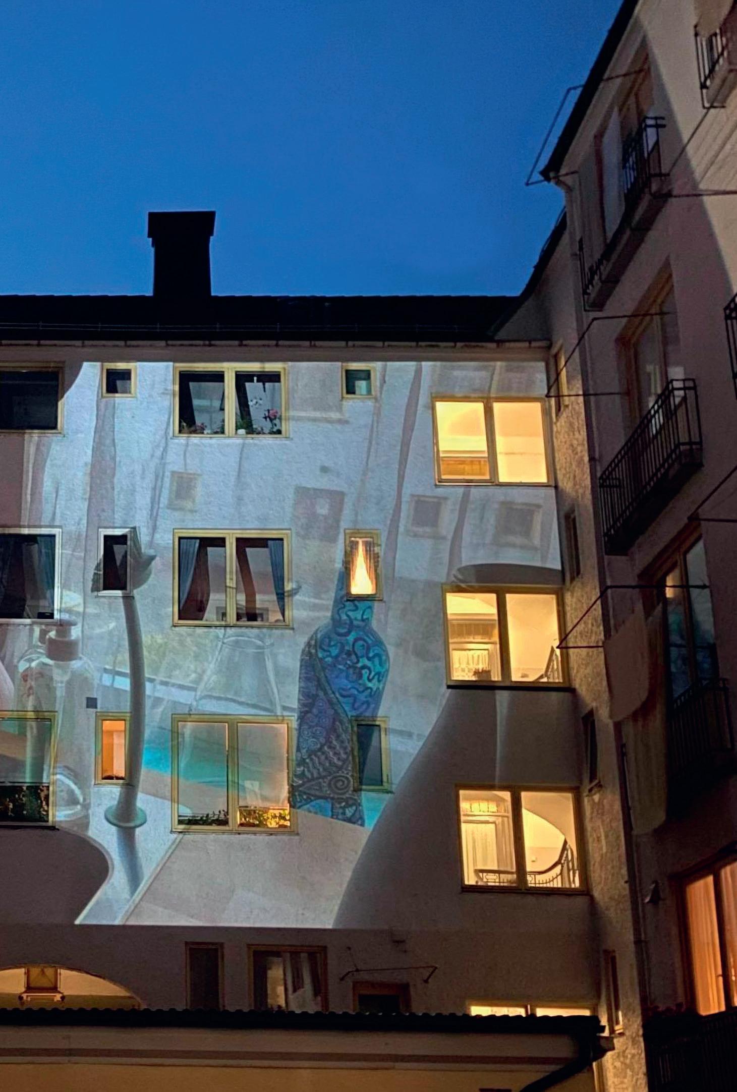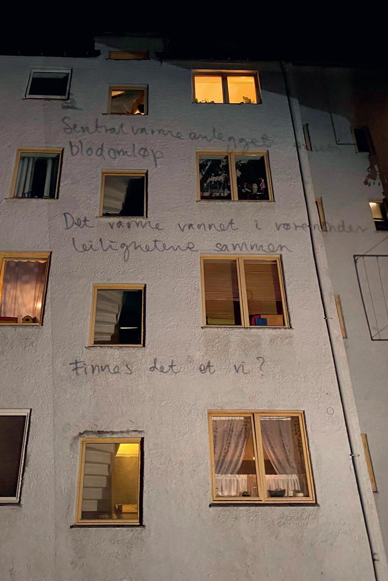 Jeg jobbet med en rekke dikt som alle tok utgangspunkt i livet i bygården, små observasjoner og undringer over fellesskapet der. Etter mye frem og tilbake bestemte jeg meg for å lage en tekstperformance, hvor jeg håndskrev diktene som jeg samtidig projiserte stort på fasaden ved hjelp av en overheadprosjektor. Jeg laget også en tekstilinstallasjon hvor plantefarget silke ble hengt opp på tørkestativene som en form for kuratert klesvask, og jeg bad naboer om å spille rollen som seg selv og dukke opp i vinduer på ulike tidspunkt gjennom kvelden – for å hente et glass vann, ta oppvasken, åpne et vindu og så videre. Disse handlingene ble ikke annonsert, og det var ikke formidlet til publikum at det ville skje, så for de som ikke visste var det som at hverdagslivet i bygården ble en del av scenen vi hadde skapt i gårdsrommet. Noen naboer ble også ufrivillig del av denne scenen ved at de kikket ut for å se hva som foregikk eller bare slukket eller slo på lyset i et rom.