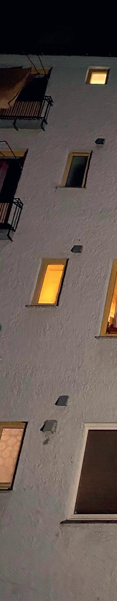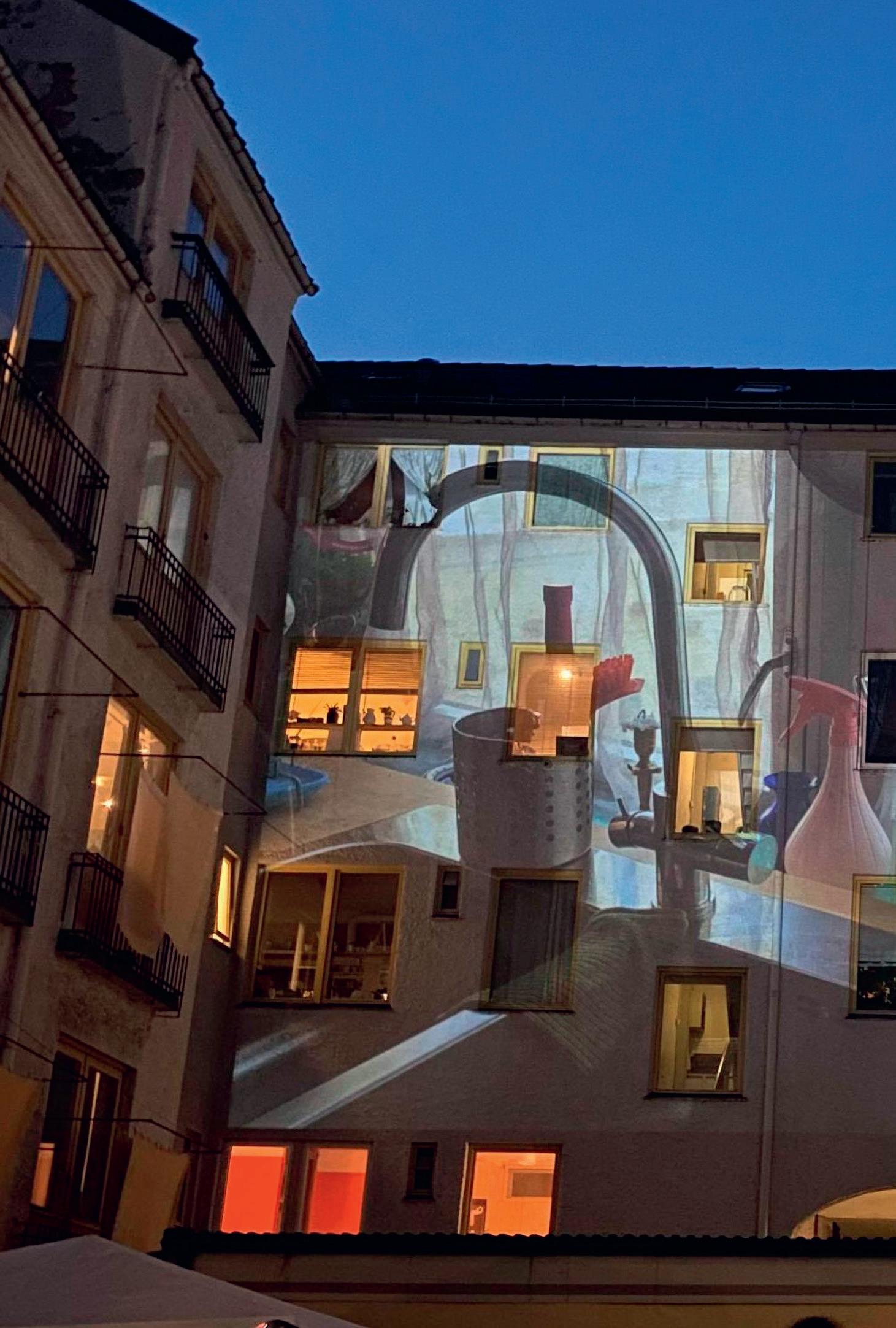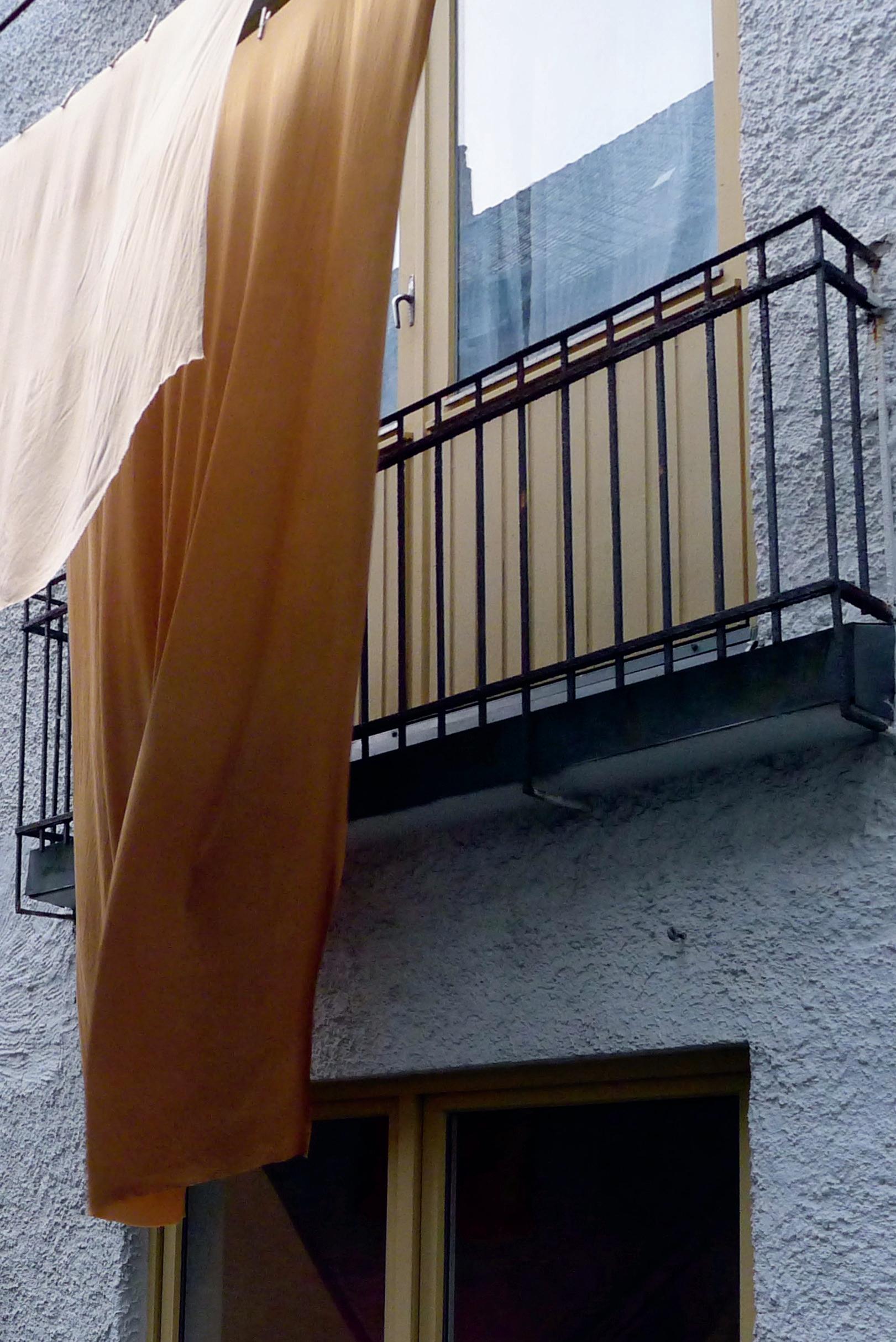 Bakgården i leiegården jeg bor i, er ganske stor, med en åpen plass på midten. Alle leiligheter har vinduer inn mot gården, og når jeg står ved oppvaskbenken, kikker jeg ut og opp mot naboenes kjøkken eller soverom. Noen har lys på, hos andre kan en se det blafrende blå lyset fra en tv, noen står i vinduet og kikker ut, andre holder på med noe. Alle lever sine liv, som ligner og samtidig er forskjellig fra hverandre, og vi deler dette bygget og denne utsikten. Alle leilighetene har også et tørkestativ montert på fasaden, og når det henger klesvask til tørk her og der, får gårdsrommet noe italiensk over seg. Denne arkitektoniske situasjonen trigget meg til å ønske å gjøre noe i dette rommet.