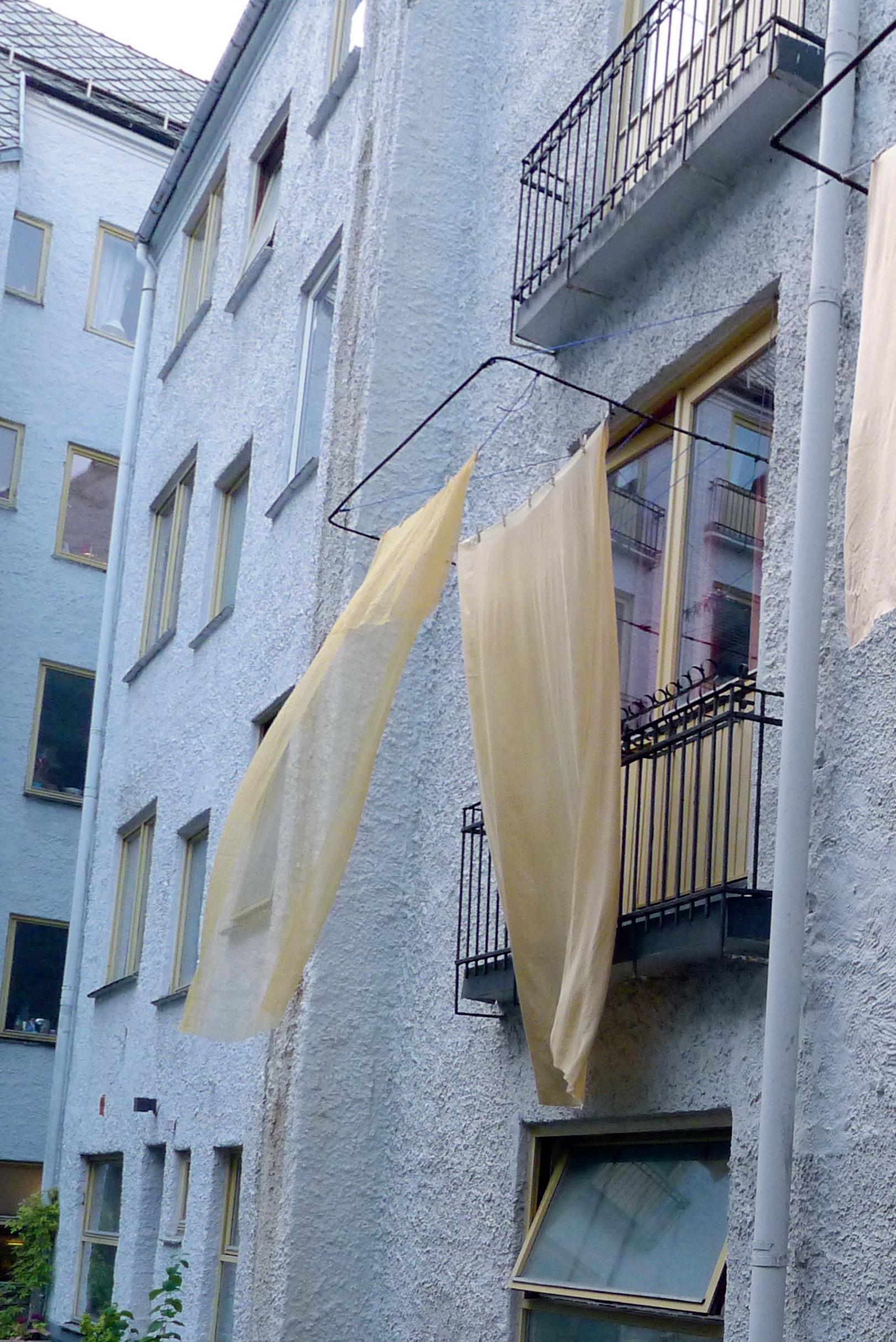 Først tenkte jeg å bruke tørkestativene til å henge opp laken som det skulle projiseres video på. Jeg så for meg å lage et flerkanals videoverk – og her må jeg nesten si at jeg ikke kan noe om video. Jeg forestilte meg at filmene skulle ha et innhold som spilte på nåtid og historie, på samme måte som historien og fortellingene sitter i veggen i dette gamle bygget – en bygård fra begynnelsen av 1900tallet hvor det blant annet fortsatt er bevart skilt som forteller at bud og tjenestefolk skal bruke kjøkkeninngangen. Vel, det var en stor og komplisert idé som jeg på ingen måte hadde kapasitet til å gjennomføre alene. Hvis jeg skulle gjøre noe kunstprosjekt her, måtte jeg på en eller annen måte involvere naboene mine. Og akkurat det satt langt inne i lang tid. Terskelen for å ta kontakt som den rare kunstneren i stedet for den vanlige naboen var høy.