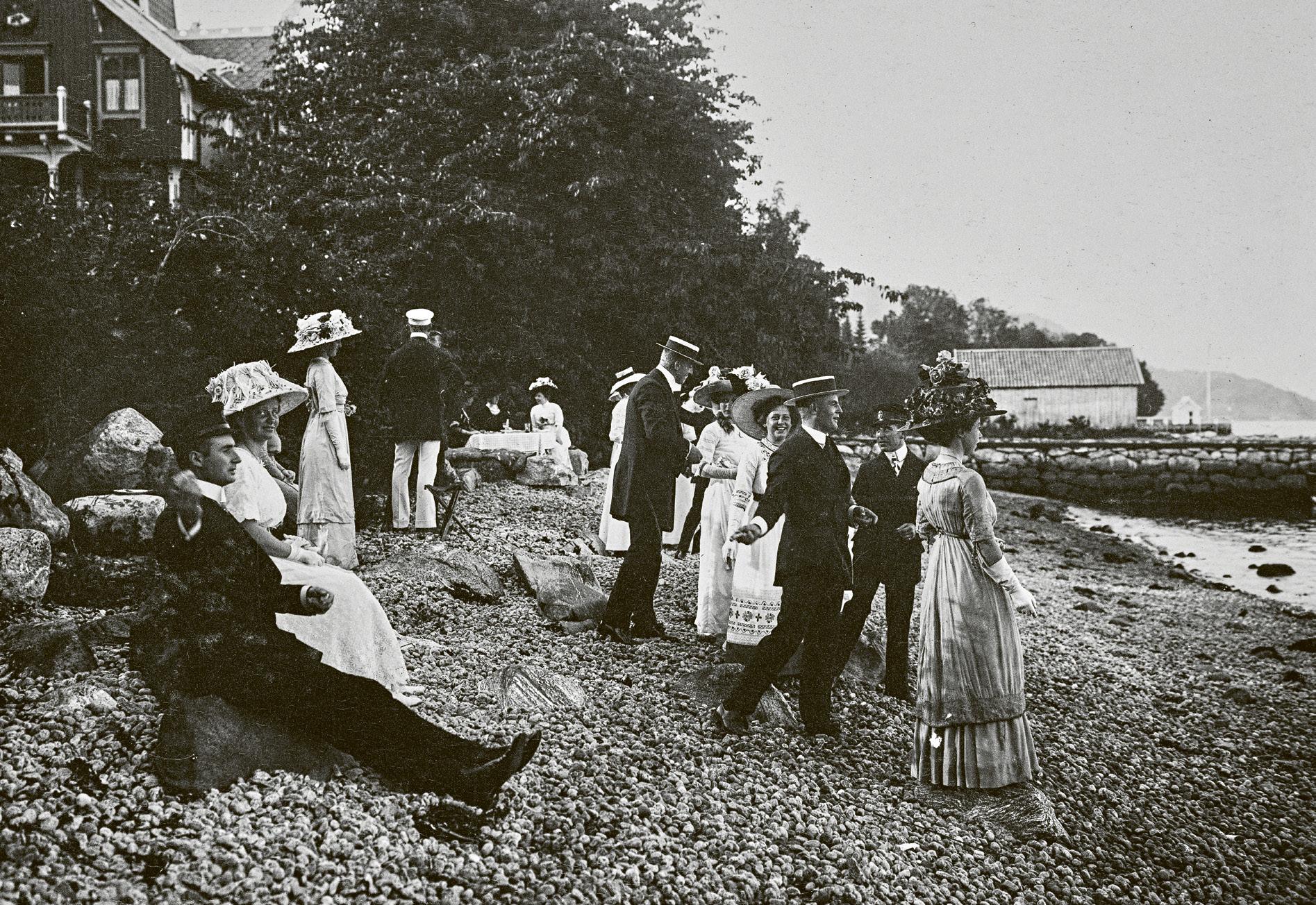 156 Uforlignelige scener fra keisertiden i Balestrand. Eline Wiese, med en av døtrene på armen, følger med fra verandaen. 157 Tyske offiserer og bergenske damer svinger seg i dansen under en av Hans Dahls hagefester.