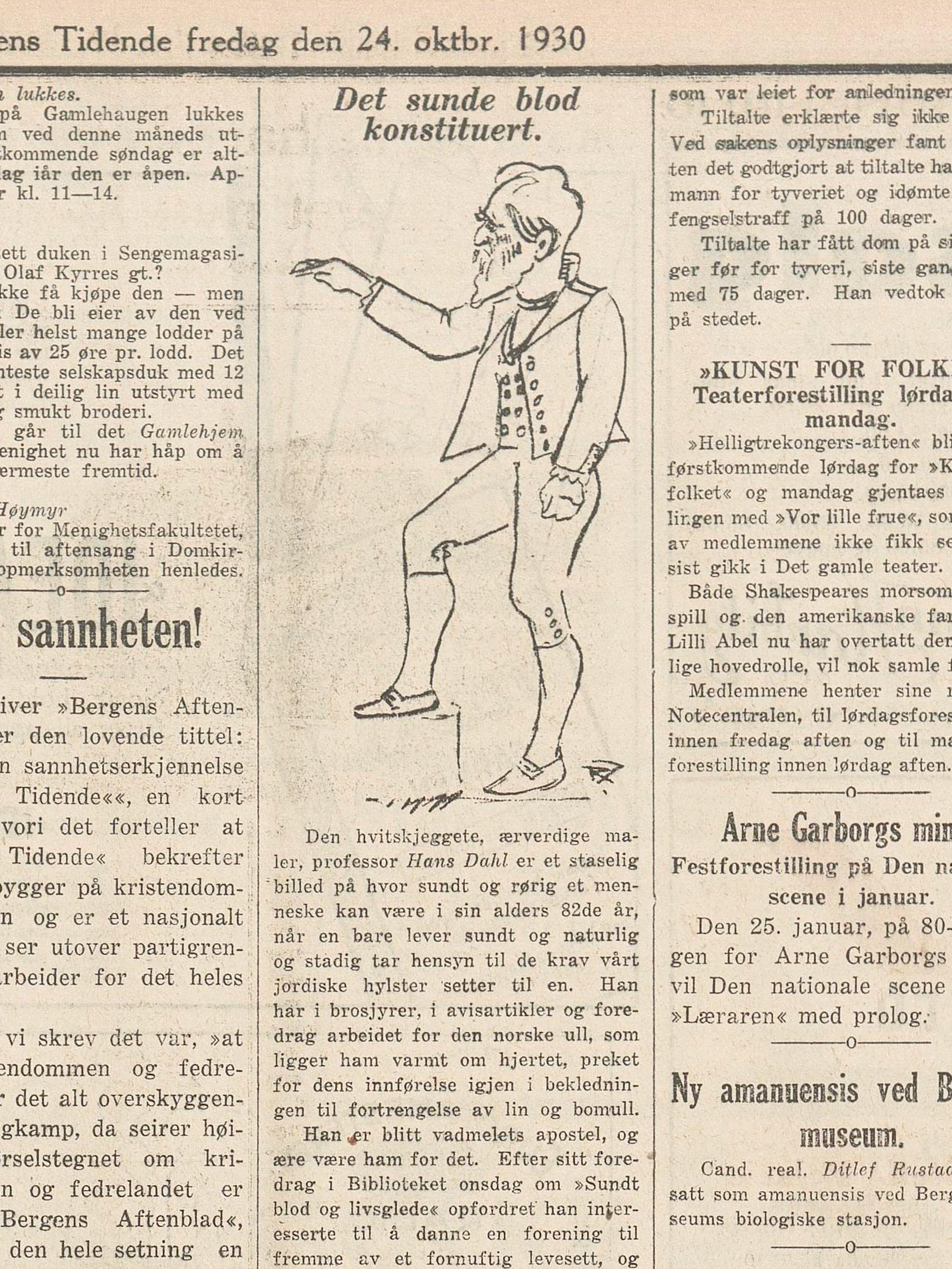 Før Dahl åpnet utstillingen i kunstforeningen, holdt han foredrag på biblioteket i Bergen med tittelen «Sundt blod og livsglæde». Etter oppfordring fra maleren selv ble foreningen Det sunde blod konstituert,398 et eget styre ble nedsatt, og foreningen skulle arbeide med å fremme folkehelse.