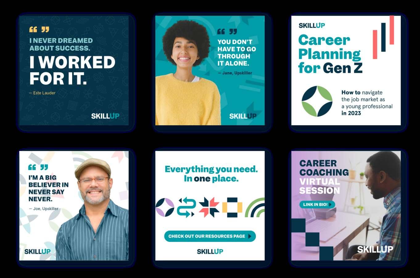 Using a distinct gradient overlay in SkillUp’s brand colors consistently across various touchpoints creates a recognizable visual signature. Applying the gradient to a photo or image also improves legibility when overlaying text and graphics by creating necessary contrast.