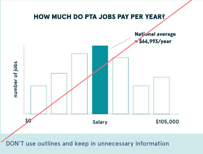 Always try to simplify everything using basic solid colors in bar charts/pie charts. Never use outlines or colors that do not represent the content.