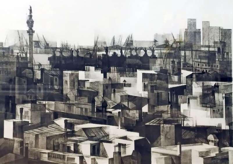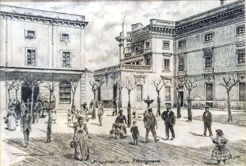 Dibujo donde representa la casa de Can Romaguera en Figueres donde estuvo en pleno desarrollo artístico. La delicadeza y la precisión del trazo describe perfectamente las texturas y el movimiento.