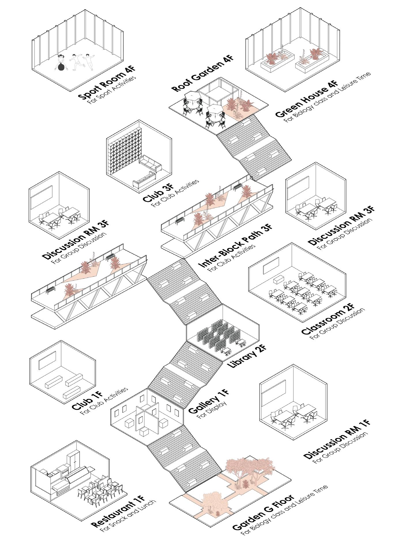 Inspired by the traditional streets and alleys of Wuhan, our design aims to break away from the conventional homogeneous campus spaces by incorporating the meandering and intricate characteristics of traditional Wuhan streets. We seek to create a flexible and engaging learning environment that integrates the concept of informal education.