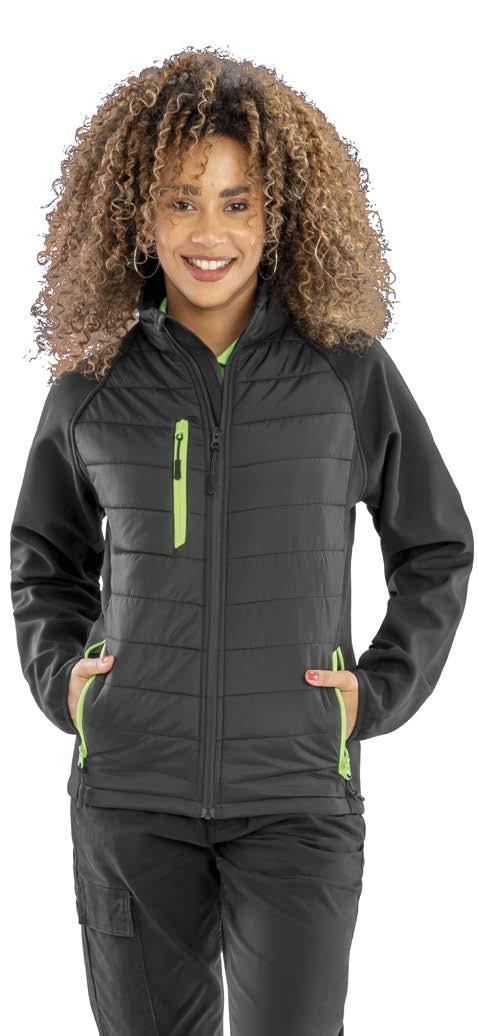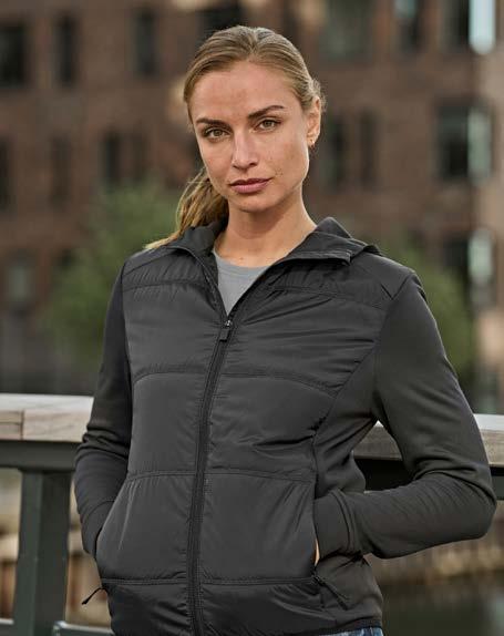 Siisti ja moderni Hybrid-Stretch -mallisto on ihanteellinen sekä työhön että ulkoiluun. Body-osan Dupont™-vanu pitää kehon lämpimänä ja joustavat paneelit tuovat liikkuvuutta. Takin hihat ovat joustavaa sileäpintaista fleeceä. Naisten takissa huppu.
