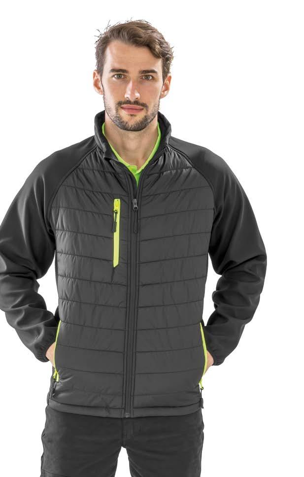 Compass-hybriditakki, jossa on yhdistelmä toppatakkia ja softshelliä. Pehmeä, kevyt ja lämmin takki värikkäillä vetoketjuilla.