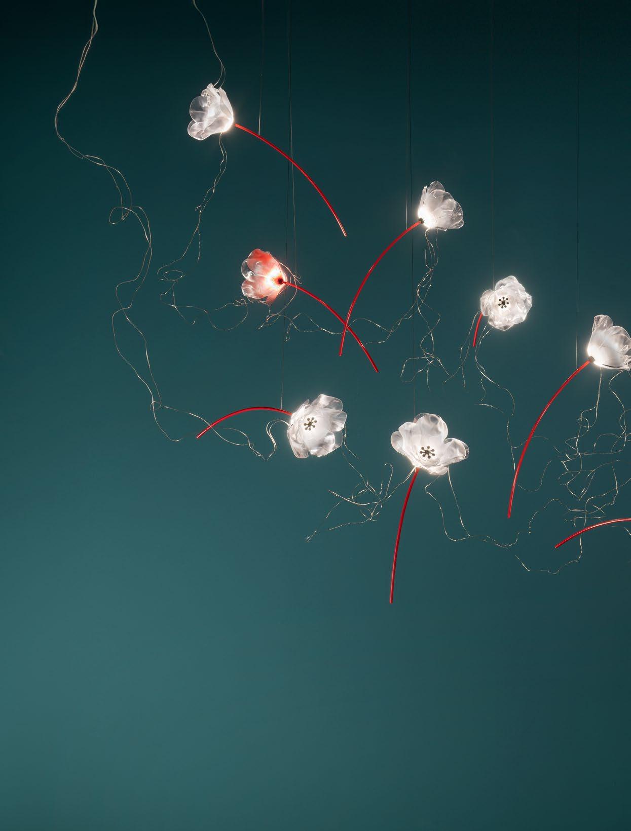 Each poppy is connected in series to the next by two thin and evocative silver-coated copper wires, which carry low-voltage electricity and give the composition a scenographic and poetic effect.