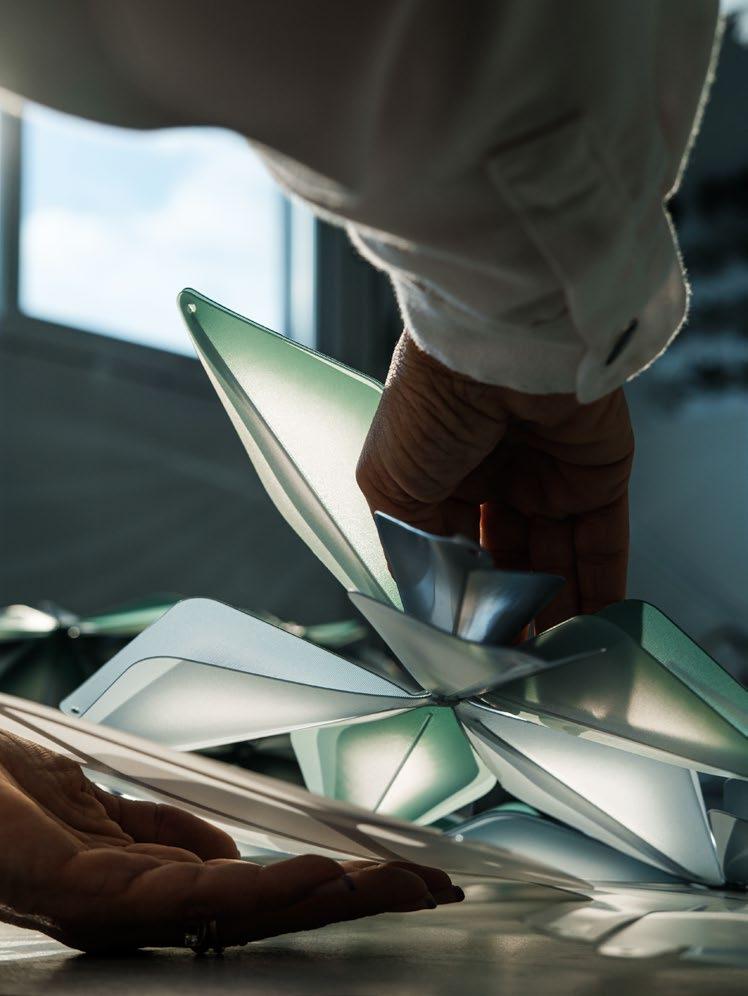 Our ability to experiment allows us to create original shapes, adaptable within space, capable of bringing to life truly unique luminous sculptures. This approach has also led us to embrace new materials such as steel and polycarbonate while preserving the distinctive DNA and recognizable aesthetics of Slamp - crafted through interlocking, cutting, and folding techniques - for our first outdoor collections.