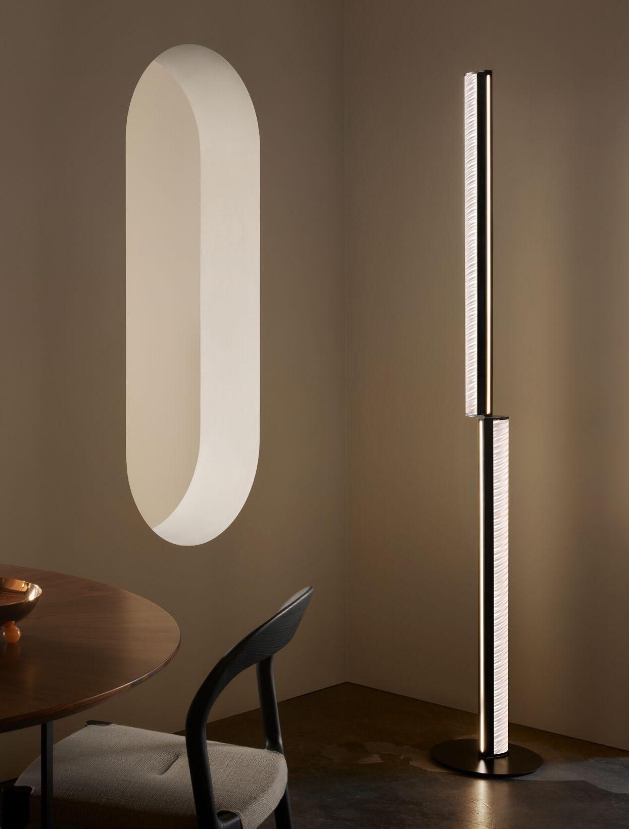 A luminous sculpture: the methacrylate core is either 180 cm (70”) or 220 cm (86”) long, illuminated evenly from end to end.