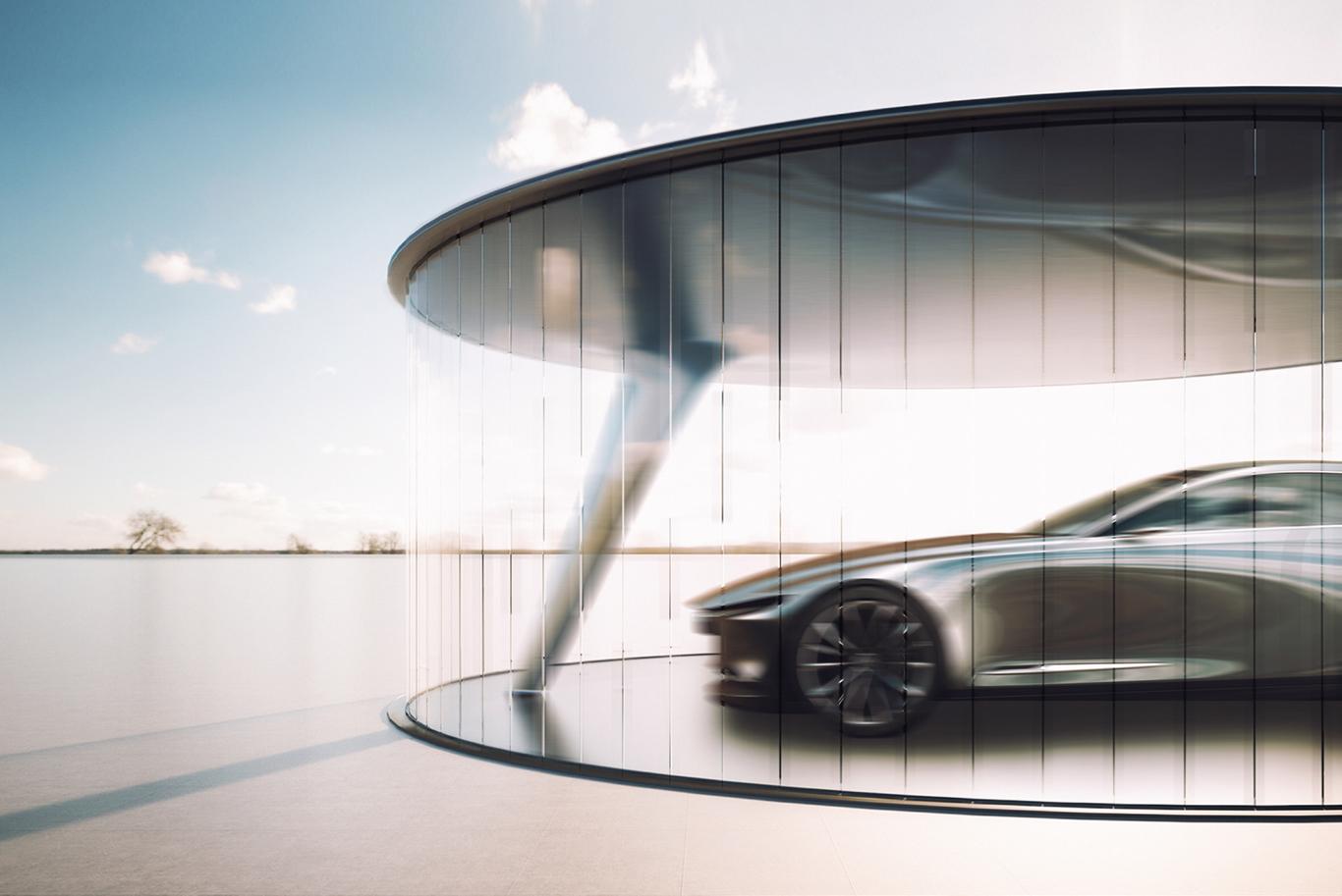Główną ideą projektu było stworzenie garażu, który nie tylko eksponuje samochód w najbardziej efektowny sposób, ale również stanowi jego stylistyczne dopełnienie. Konstrukcja została zaprojektowana jako dynamiczna, minimalistyczna forma dachu, płynnie łącząca się z podłożem. Zamiast tradycyjnych drzwi garażowych zastosowano przesuwne panele szklane, które podkreślają lekkość bryły i umożliwiają niezakłóconą prezentację pojazdu. Przeszklone ściany dodatkowo potęgują efekt ekspozycji, czyniąc samochód centralnym punktem przestrzeni.