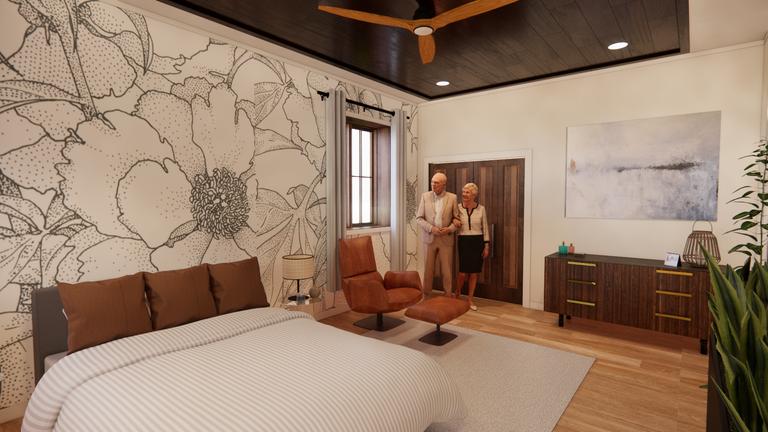 Here you can see how the living space transforms in phase two to create a smaller, more ambulatory unit as residents age. In this phase grab bars would be added in the bathrooms.