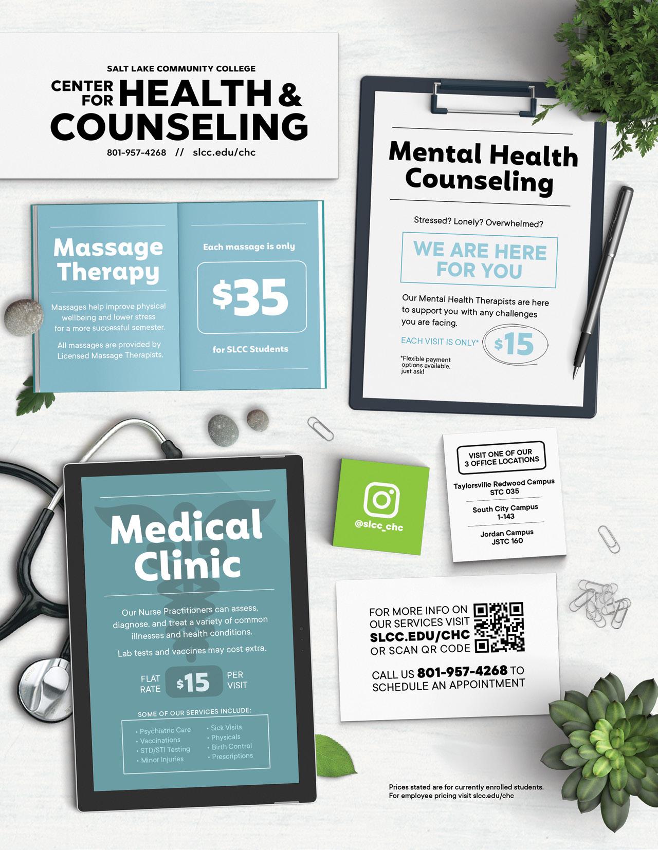 We provide quality, accessible, and affordable health and wellness services, including mental health counseling, medical services, and massage therapy. Medical and counseling appointments are as low as $15 a session, but if cost is a barrier, just ask our staff about our fee-waivers! Call 801-957-4268 or visit slcc.edu/chc for more information about the services offered, prices, providers and more! Additional information on page 38.