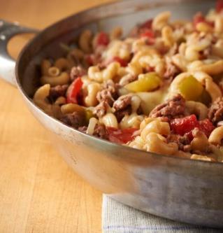 Cook macaroni according to package directions. In a colander, drain macaroni and rinse with cool water. Set aside. While macaroni cooks, rinse and dice bell pepper. Peel and finely chop onion. Peel and mince garlic. Set aside. In a large skillet over medium heat, cook beef or turkey, bell pepper, onion and garlic, crumbling the beef with a mixing spoon or spatula, until meat is no longer pink, about 15 minutes. Using a colander, drain off excess fat. Return to the skillet and stir in macaroni, tomatoes with their juices, thyme, salt and pepper. Sprinkle with cheese. Cover and cook over medium heat until cheese is melted, about 5-7 minutes. Serve immediately. Keep covered in refrigerator up to 3 days. Prep Time: 20 minutes Cook Time: 20 minutes. Serving Size: 2 cups. https://familynutritionprogram.org/cheesyhamburger-skillet/. Serves: 4.