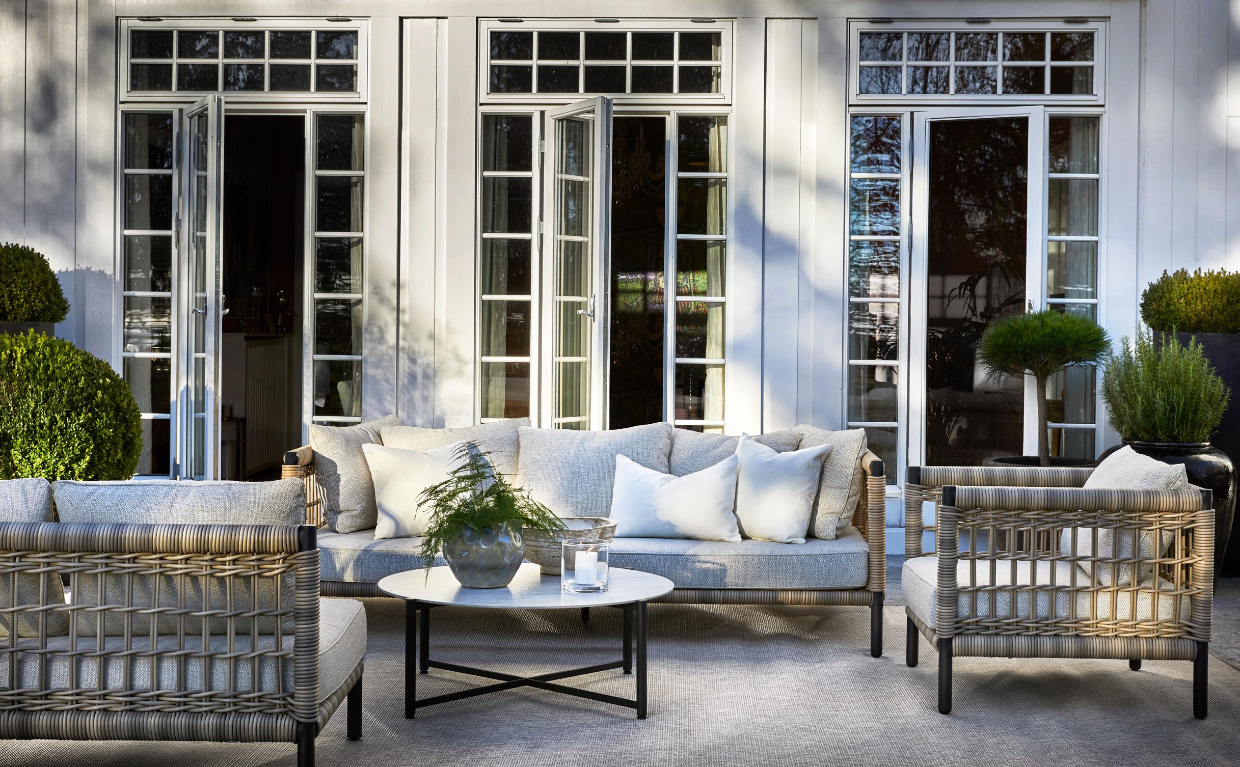 Marty hagemøbler er skapt i materialer som tåler både bruken og påkjenningen som nordiske somre kan by på, uten å kreve mye vedlikehold. Her med Marty stoler, Marty hammock, Harbour sofabord og Rom måltilpasset teppe som skaper en lun ramme for sofagruppen.