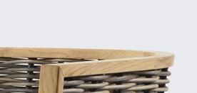 Daybed med buet rygg i vedlikeholdsfri flett, høykvalitets teak og sort aluminium. Hel setepute og fem vendbare ryggputer i Fontelina tekstil som kan vaskes skånsomt. Leveres i to deler som kan skrus sammen. Design: Torill Slettvoll. Mål: B 151, D 150, H 67/80, SH 41.
