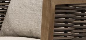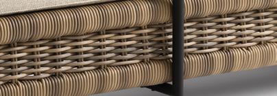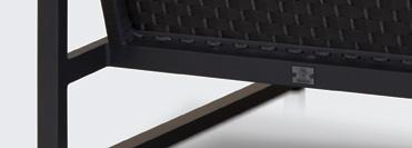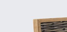 Treseter med buet rygg i vedlikeholdsfri flett, høykvalitets teak og sort aluminium. Smussavvisende putetrekk i Fontelina tekstil som kan vaskes skånsomt. Design: Torill Slettvoll. Mål: B 210, D 88, H 67/80, SH 41.