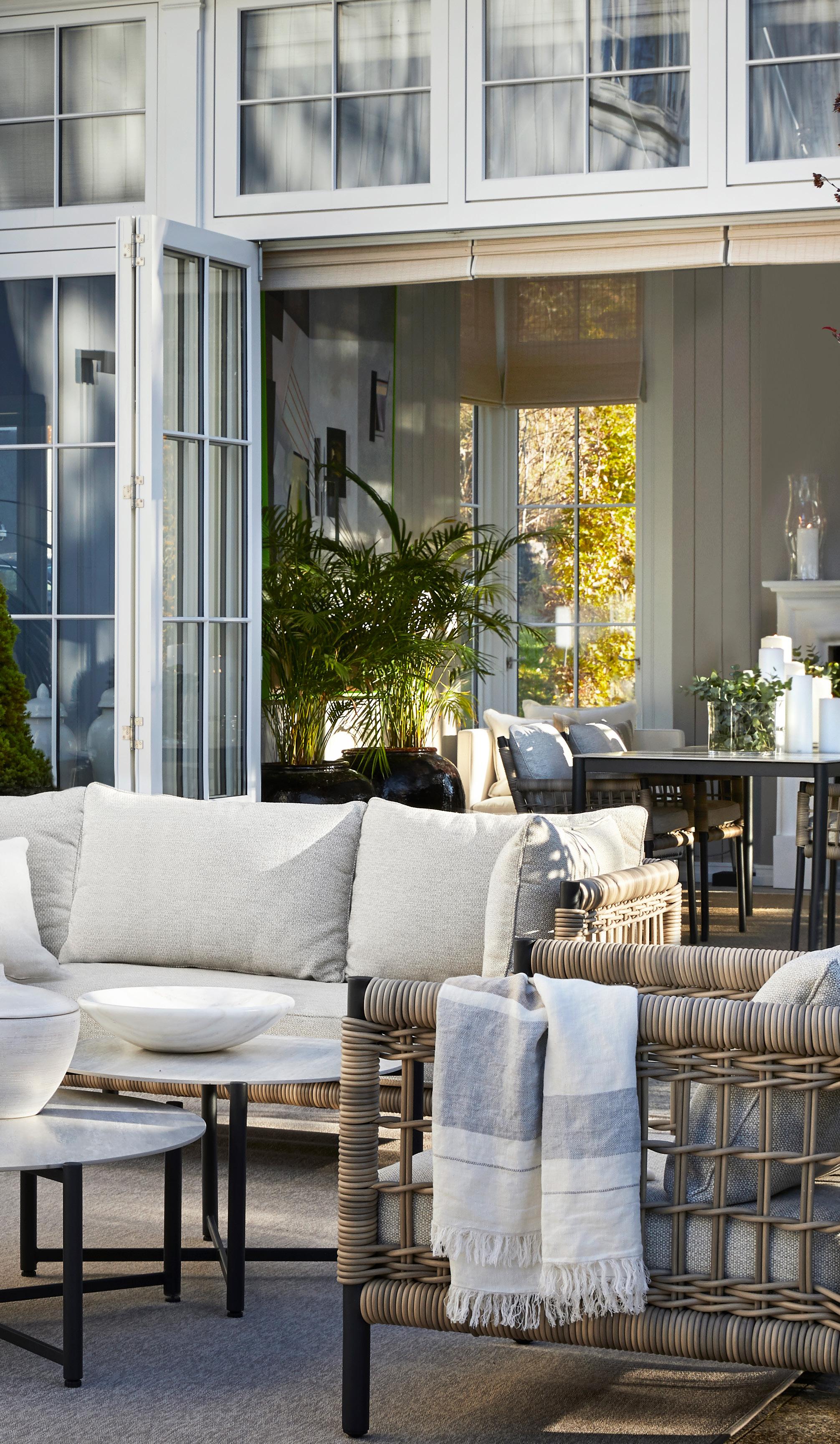 Marty treseter sofa, Marty stol uten arm og Harbour sofabord. Pynteputer, pledd og dekor fra Slettvoll.