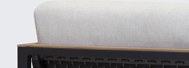Treseter med sort aluminiumsramme med teakdetaljer og dekorativ olefin tekstilflett i ryggen. Quick Dry-puter med avtakbart trekk i Copa Natur tekstil som kan vaskes skånsomt. Design: Slettvoll. Mål: B 203, D 78, H 60/73, SH 40.