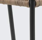 Stol uten armlener, med rygg i vedlikeholdsfri flett og sort aluminium, og en korsryggpute. Smussavvisende, avtakbare putetrekk i Fontelina tekstil som kan vaskes skånsomt. Design: Torill Slettvoll. Mål: B 60, D 79, H 75, SH 40.
