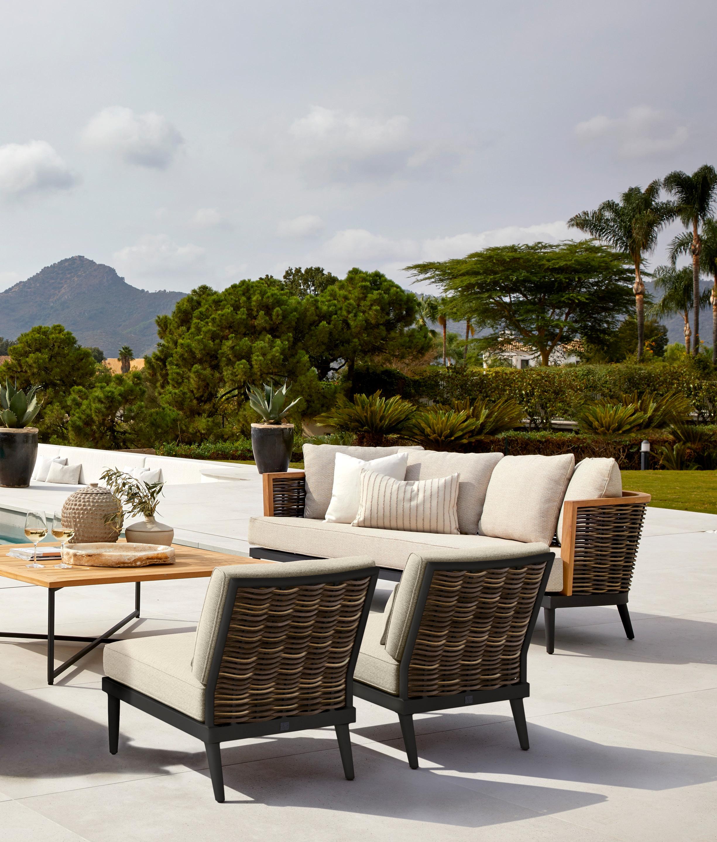 Marty finnes i flere varianter, deriblant sofa, stol, pall, solseng og hammock. Felles for de alle er kombinasjonen av estetikk og varighet – med et raffinert formspråk og slitesterke materialer.