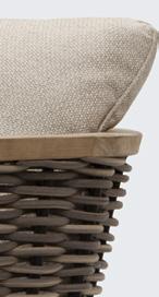 Stol med høy, buet rygg i vedlikeholdsfri flett, høykvalitets teak og sort aluminium. Tre ryggputer i tre ulike størrelser. Smussavvisende, avtakbare putetrekk i Fontelina tekstil som kan vaskes skånsomt. Medfølgende pall i Fontelina tekstil og sort aluminium. Design: Torill Slettvoll. Mål: B 103, D 88, H 112, SH 40. Pall: B 80, D 50, H 38.