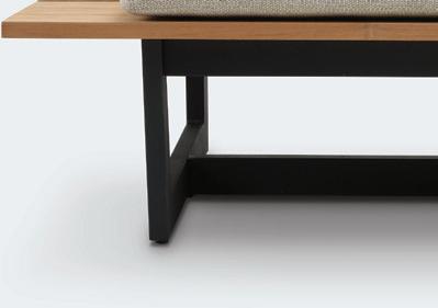 The Rodi bench is crafted from premium teak with a black aluminium frame. Its clean, understated design looks equally at home, by the sea, in the mountains, or in the garden. The seat cushion can be secured to the bench and is compact to store when not in use. The cushion is slightly shorter than the bench, creating a practical surface beside it for placing a cup of coffee.