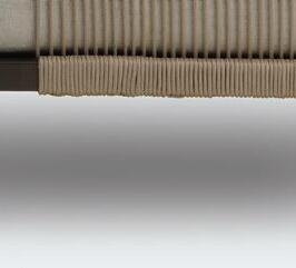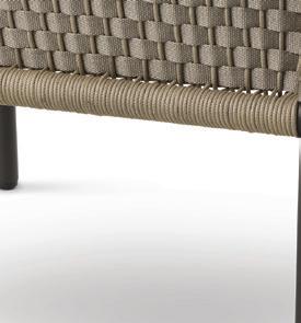 The Elm sofa features a bronze-coloured frame that fuses perfectly with the warm tones of the rope and the light upholstery of the cushions. The cushions are made from practical, quick-drying materials. The Montego chair has a bronze-coloured frame with stainless steel legs. Together, these Elm and Montego pieces form an inviting grouping with the Anzio coffee table, that features a durable ceramic granite top which is highly resistant to stains, sunlight and scratches.