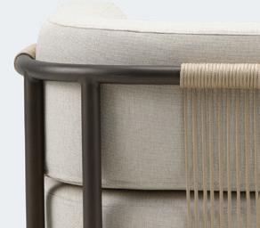 Armchair in bronze-coloured aluminium with linen-coloured Olefin woven textile. Quick Dry cushions with removable covers in Copa natural fabric, suitable for gentle washing. Design: Slettvoll. Dim.: B 71, D 71, H 75, SH 39.
