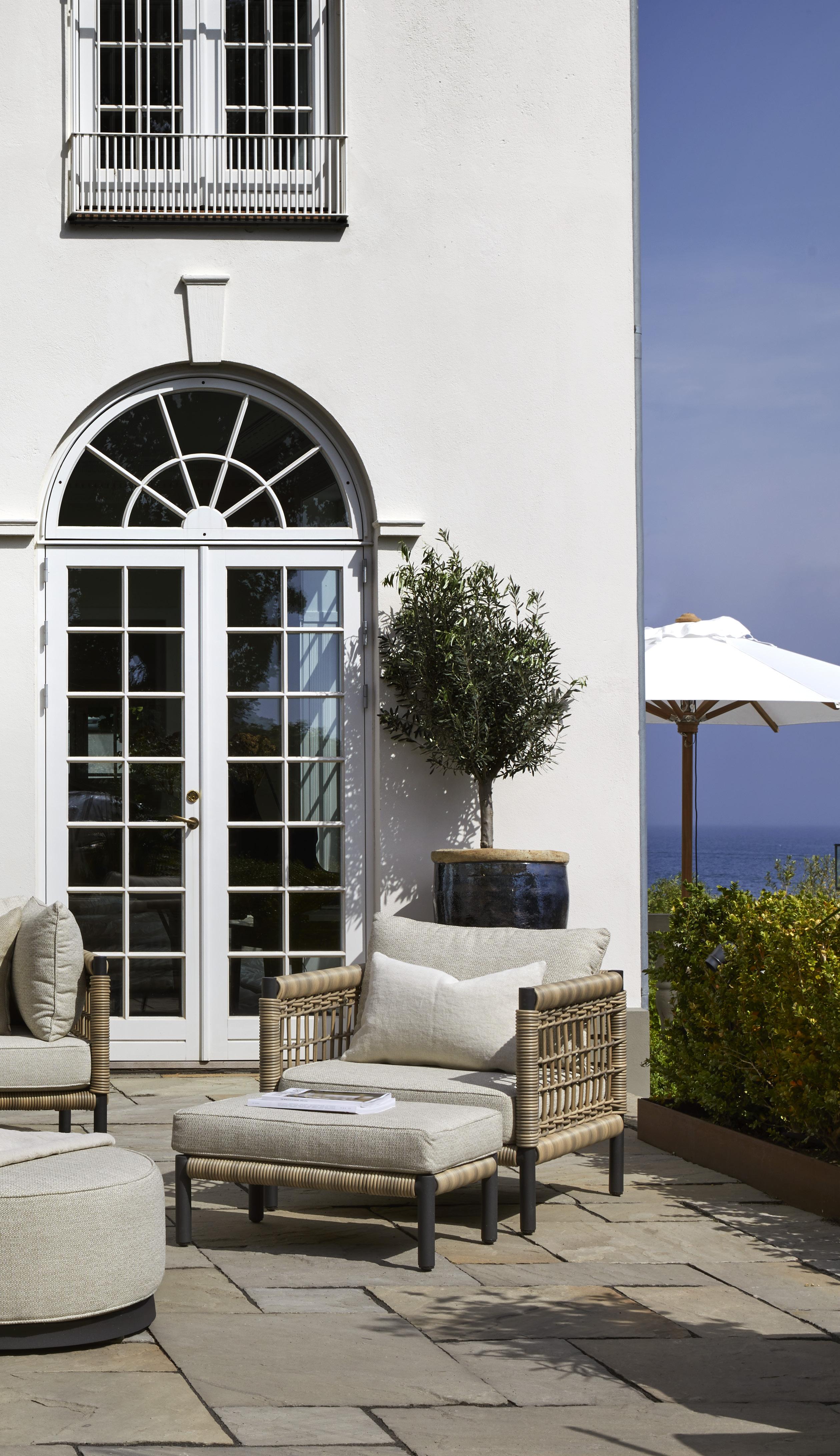Elm sofa, Montego chair, Anzio coffee table and Shady parasol. Custom-made rug and décor from Slettvoll.