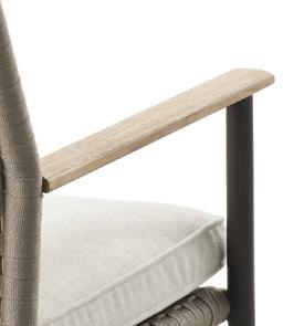 Durban is a stackable aluminium dining chair with teak detailing, and a highly durable textile weave. It is also now available in a new linen-coloured weave and bronze-coloured aluminium. The seat cushion is made from Quick Dry material that is rain resistant and dries quickly. It’s shown here around the Anzio dining table with bronze-coloured aluminium legs and a ceramic granite tabletop.