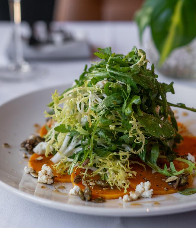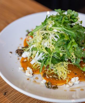 FALL SALAD WITH BUTTERNUT SQUASH CARPACCIO, ARUGULA, BROWN BUTTER VINAIGRETTE, SPICED PUMPKIN SEEDS, BOURBON MAPLE DRIZZLE, GOAT CHEESE