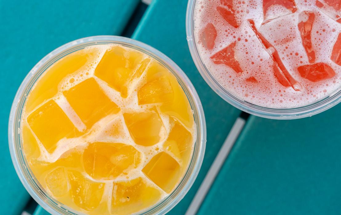ORANGE DRINK IS THE SETTER, WITH VODKA, PEACH SCHNAPPS, ORANGE JUICE, CRANBERRY; AND PINKER DRINK IS THE ACE, WITH COCONUT RUM, PINEAPPLE JUICE, SODA WATER, AND GRENADINE