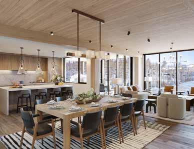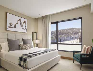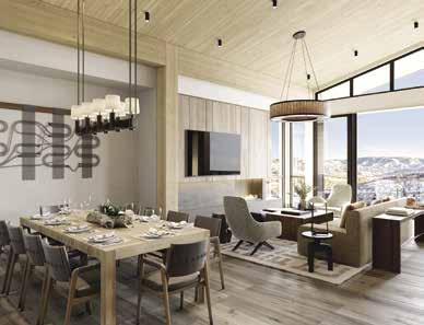 Private corner residence with immediate access to Aura Lounge, Grotto and Ski Locker Room. Walk-out ski-slope patio with large operable window walls and direct access to ski/hiking trails. Flex room allows owners to personalize use, whether office, bedroom, or media room. Spacious entertaining kitchen showcases Wolf appliances and large kitchen island. Private, direct elevator access via a gracious residence entry. Luxurious primary bedroom with walk-in closet and spa-inspired bathroom. Ensuite guest bedrooms with an additional powder room plus shower for the flex room. Pricing and all information subject to change. Artist’s conceptual rendering used are intended solely for illustrative purposes.