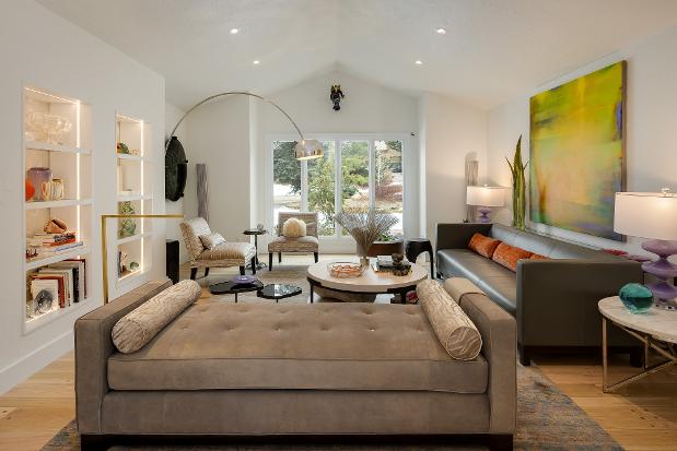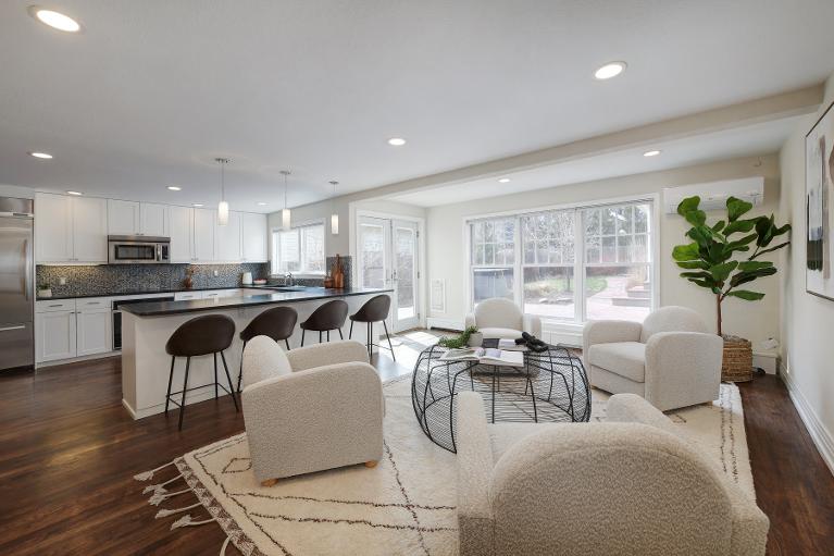 Thecozy-yetcontemporaryliving spaceisanchoredby aneye- catching fireplace.