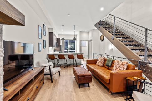 Thecozy-yetcontemporaryliving spaceisanchoredby aneye- catching fireplace.
