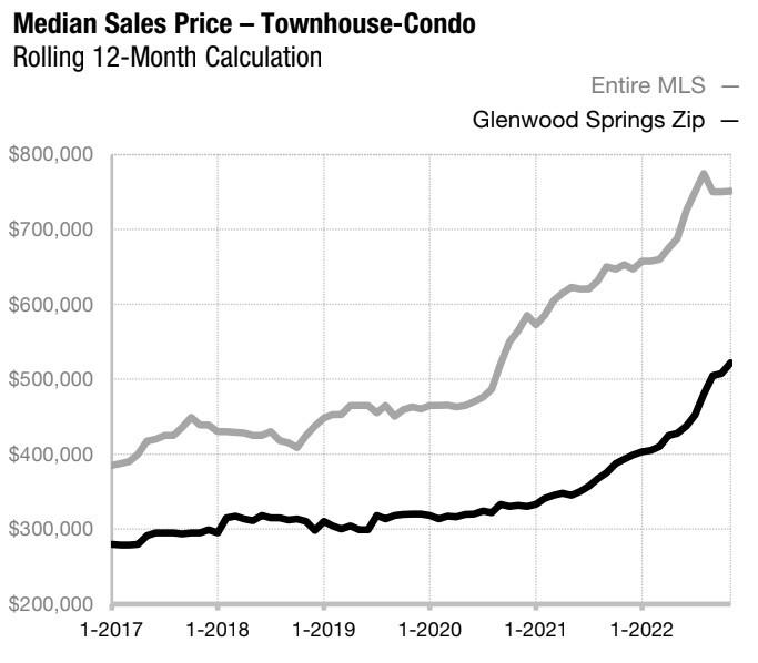 Median Sales Price $341,000 $357,500 +4 8% $337,500 $359,000 +6 4% Average Sales Price $344,313 $357,500 +3 8% $347,585 $398,884 +14 8% %of List Price Received 100 6% 98 0% -2 6% 100 4% 100 7% +0 3% Days on Market 9 17 +88 9% 17 13 -23 5% Inventory of Homes for Sale 13 6 -53 8% -- -- -Months Supply of Inventory 2 5 1 2 -52 0% -- -- -Med ian Sales Pr ice- Sing le Fam ily Rolling 12-Month Calculation Med ian Sales Pr ice- Tow nho use/ Co nd o Rolling 12-Month Calculation Current asof December 5, 2022 All data from the Aspen/Glenwood SpringsMLSInc Report © 2022 ShowingTime