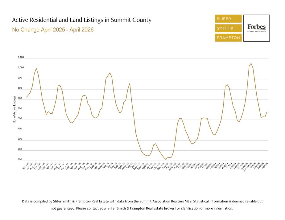 AswemovethroughApril 2026,Summit County nventoryremainsvirtuallyunchangedfrom thistimelast year,with581activelistings,502residential and 79 land.Despiteongoingshiftsin thebroader market,supplyhasheld steady,keepingconditionsrelat velyconstrained, particularlyontheresidential side.Thisconsistencyreinforcesastrategy-drivenmarket.With no meaningful increaseininventory,successcontinuesto comedownto pricing,preparation, andexecut on.Sellerswho position correctlycanstill capitalize,whilebuyersneedto beready to movewhentheright opportunitypresentsitself.