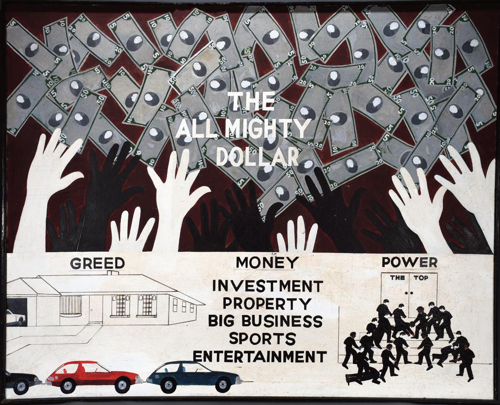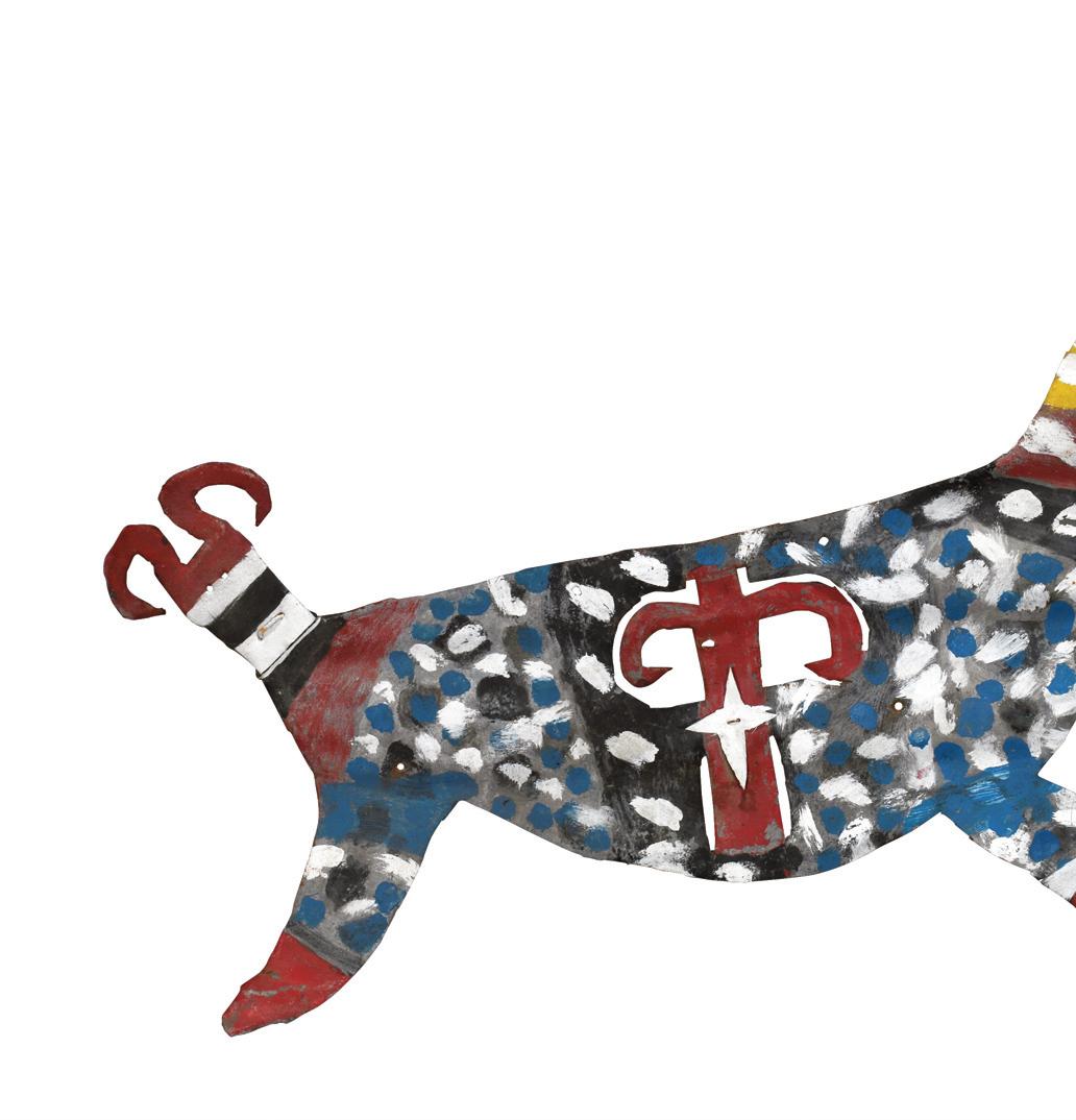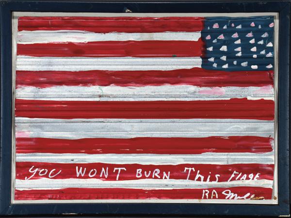 Initialed. Paint on found used roofing tin. Excellent found environmental condition. Image is 32" w x 24.5" . Frame is 35" w x 26” h. Est. $10,000-20,000. Ship: $200