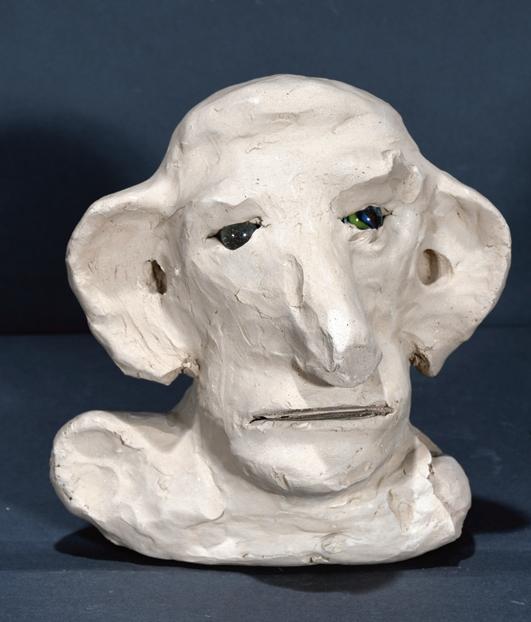 Dark rust brown glaze with china teeth and eyes. Minor base loss during firing, otherwise excellent condition. 7" h. Est. $500-800. Ship: $45
