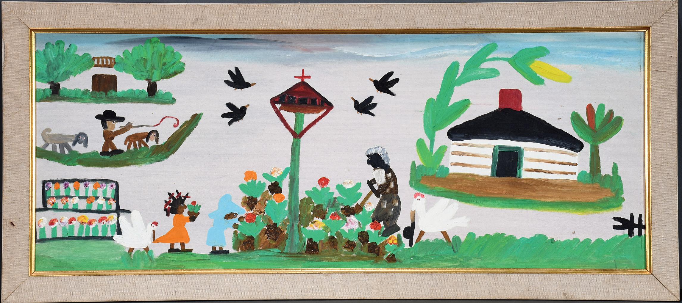 Signed. Oil and varnish on cotton feedsack. Excellent condition. Frame is 22" w x 26" h. Est. $200-$400. Ship: $65