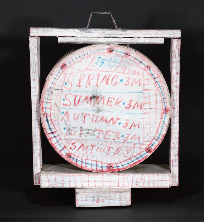 c. 1989. Signed. Sign painter's enamel on found masonite. Excellent condition.